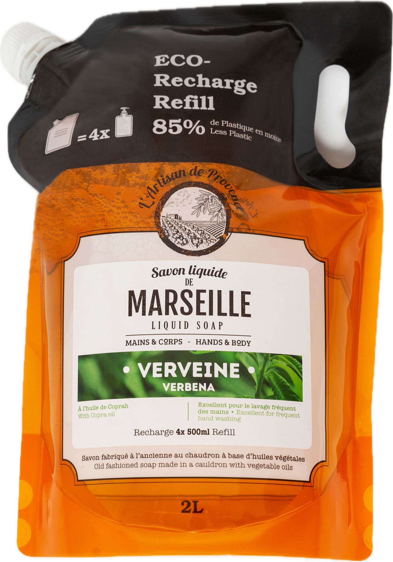 Verveine liquid Marseille soap is made by a master soap-maker using the traditional Marseille method. It is formulated in a cauldron with 100% vegetable oils, including Copra for its softening and moisturizing benefits, and for its creamy lather. Naturally glycerinated, it cleanses deeply and gently without aggressing the skin. Suitable for frequent, regular washing of hands, body and face, it keeps skin moisturized without drying it out. Leaves a subtle fragrance of cleanliness and freshness.