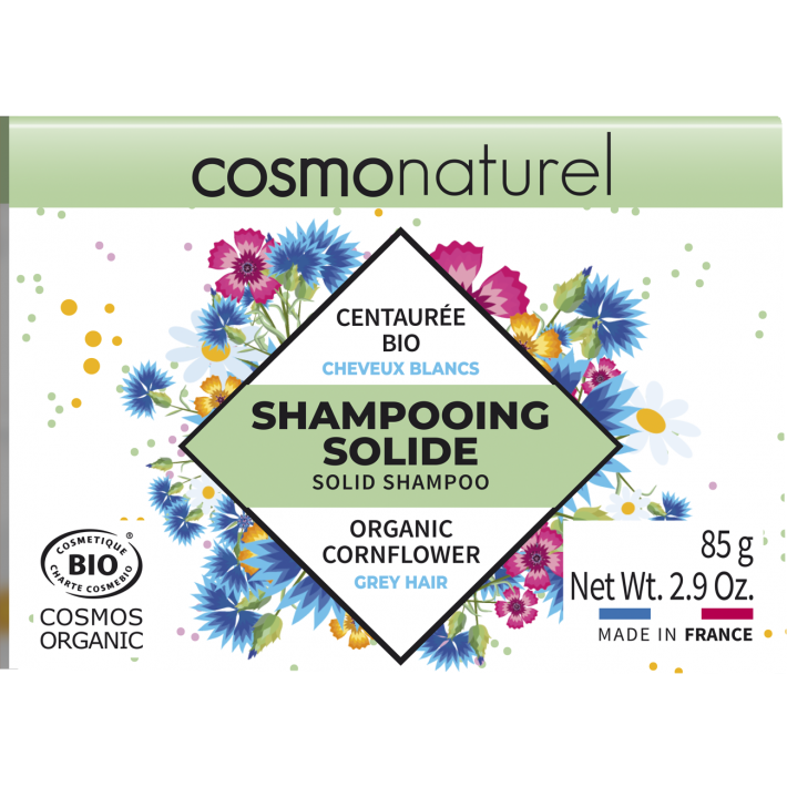 Ce Shampooing Solide certifié BIO à la centaurée, aide à raviver l'éclat des cheveux blancs et leurs reflets argentés.